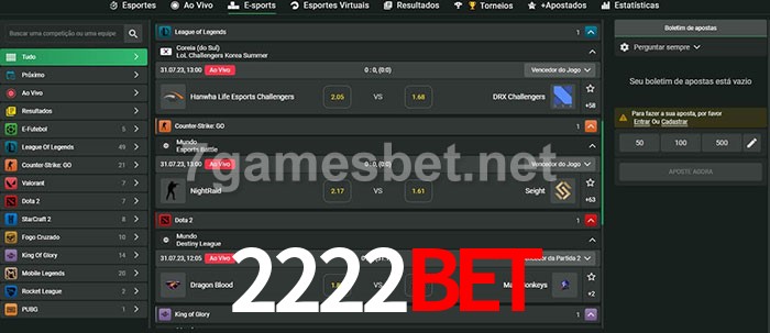 O 2222Bet oferece uma grande seleção de opções de apostas em e-sports com probabilidades competitivas